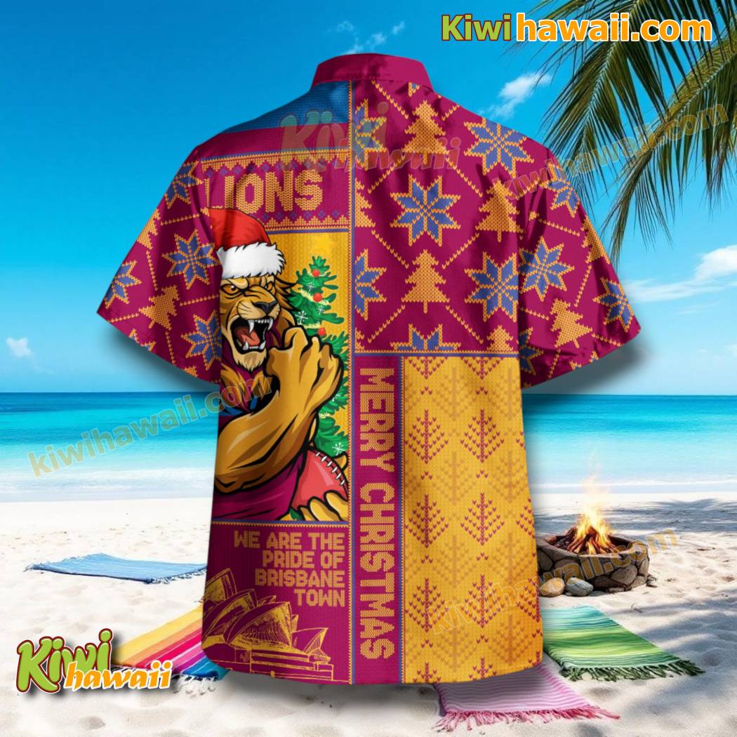 Keywords: Brisbane Lions, AFL, Australian Football League, Christmas, Hawaiian Shirt, Beach Shirt, Summer Shirt, Short Sleeve Shirt, Polyester, Button-Down, Holiday, Team Spirit, KiwiHawaii, Party Shirt, Queensland