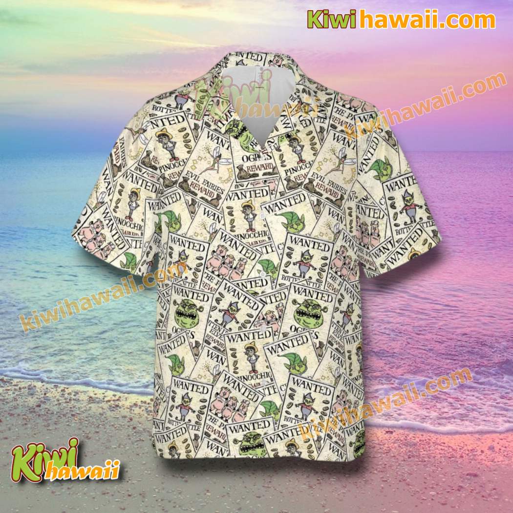 Keywords: Shrek, Fairytale, Wanted Posters, Hawaiian Shirt, Beach Shirt, Summer Fashion, Movie Merchandise, Fan Apparel, Unique Design, Summer Short Sleeve, Polyester Fabric, Casual Button-Down, KiwiHawaii, Dreamworks